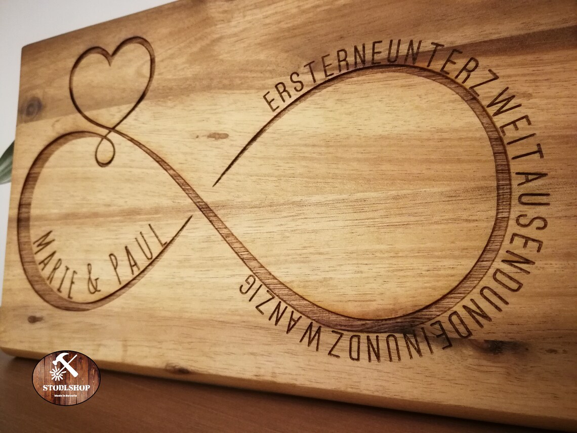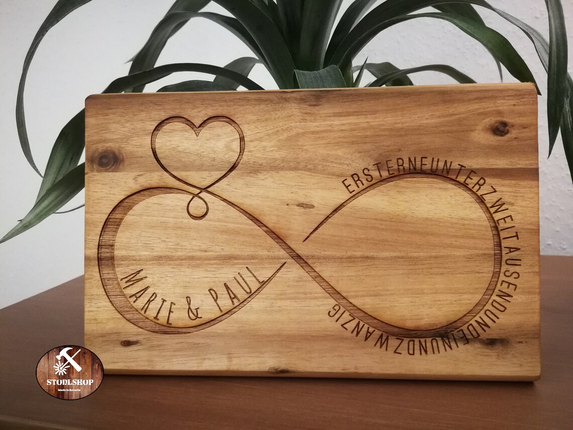 Das wunderschöne Brotzeit-Brettchen aus Akazienholz mit graviertem Unendlich-Zeichen Aufschrift ist das ideale persönliche Geschenk zu Hochzeit, Geburtstag, Valentinstag o.ä.